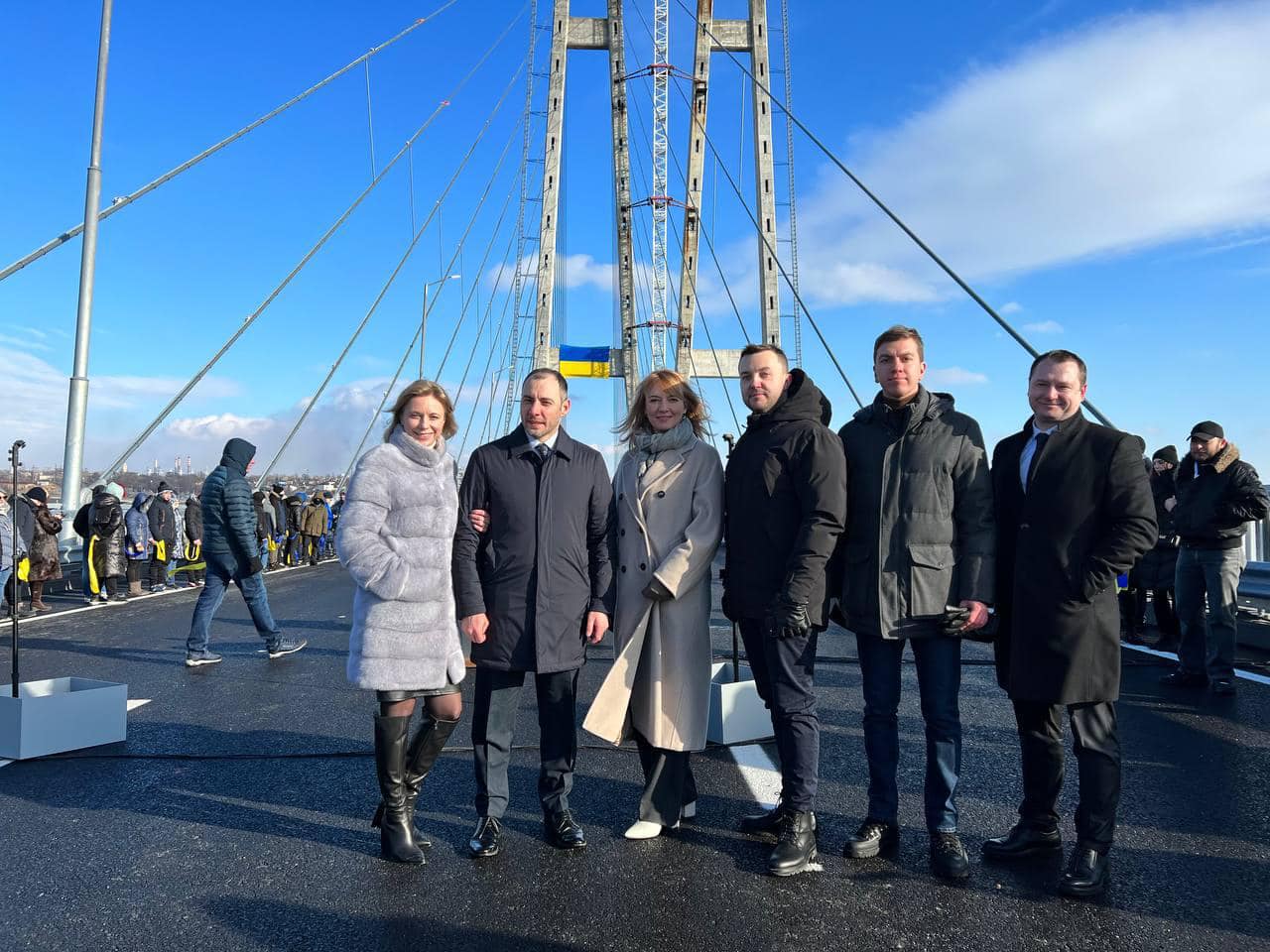 Запорізький міст-довгобуд, що знаково відкрили у День Соборності України, об’єднує два береги Дніпра та є стратегічно важливим для країни. Про це заявила очільниця партії «Слуга Народу» Олена Шуляк, яка взяла участь у відкритті верхової частини нового вантового мосту.