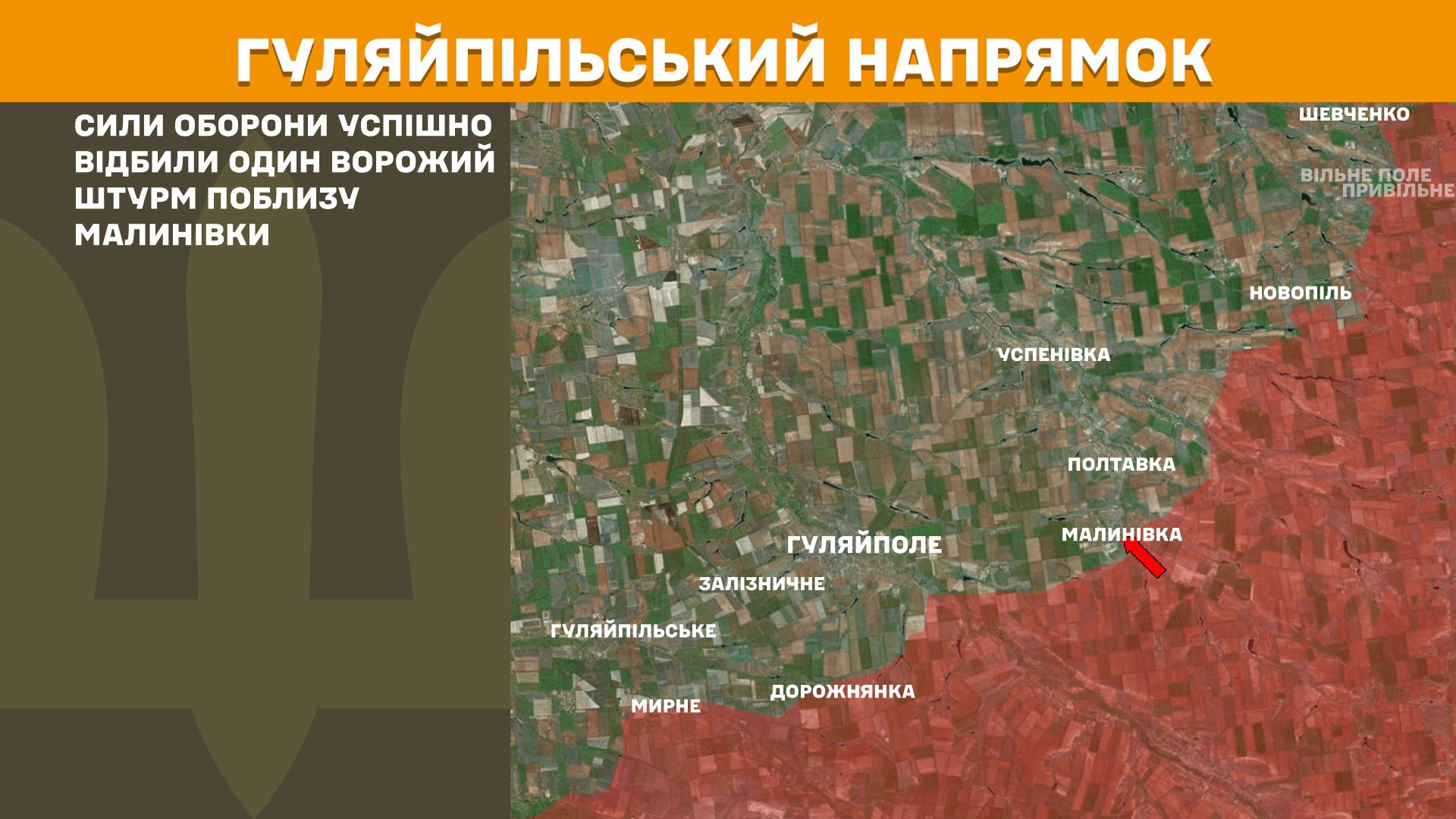 Гуляйпільський напрямок залишається стабільно гарячим. Ворог здійснив чергову спробу наступу поблизу села Малинівка, однак вона завершилась для нього невдало. Сили оборони України оперативно відреагували, завдавши шкоди штурмовим групам противника та змусивши їх відступити.