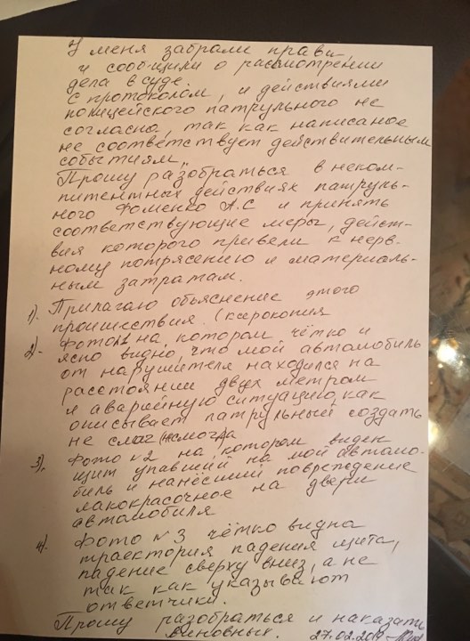 После приезда полиции, по словам Людмилы, патрульный не захотел полностью выслушивать версию заявителя и пообщавшись с парнями из Volkswagen составил протокол уже на Людмилу, определив, что уже она, якобы, создала аварийную ситуацию. Также женщина отмечает, что у нее сложилось впечатление, что парни были знакомы с полицейским.