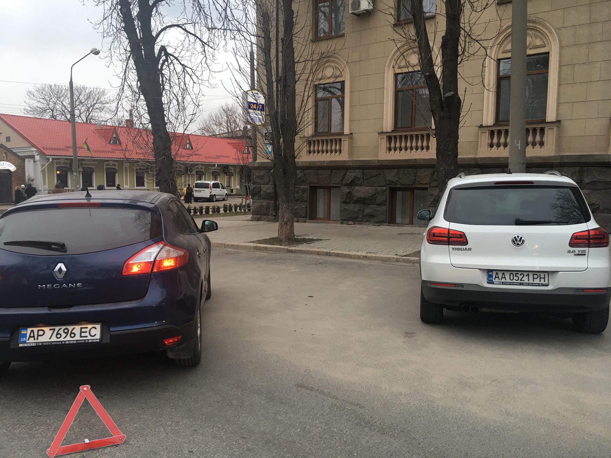 Renault Megane запорожанки получило царапины. На вопрос к молодым парням “Что вы делаете, я сейчас вызову полицию?”, те резко забрали щит и ушли с ним в здание отеля.