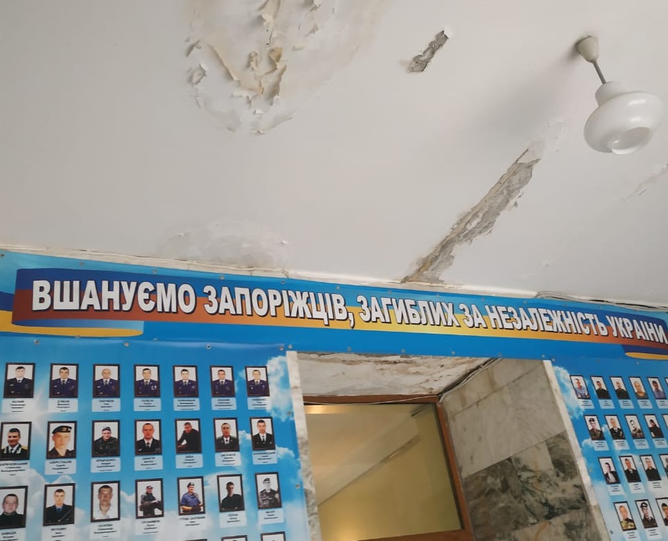 При входе здесь расположены портреты героев-защитников Украины, уроженцев Запорожья, который погибли защищая независимость нашей страны на Донбассе. При этом, находятся они на фоне потрескавшихся и обшарпанных стен и потолков, что несет по себе грустное зрелище.