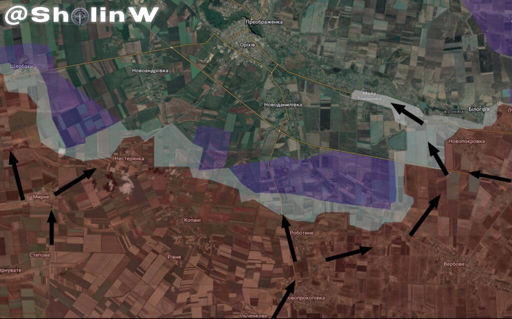 Ворог протягом дня провів ряд штурмових дій по відтинку Щербаки-Нестерянка-Роботине-Новопокровка-Мала Токмачка, використовуючи різноманітну техніку від важкої (у вигляді танків, БМП, БТР з піхотою) до мотоциклів, які також намагалися на швидкості заїхати як можна далі в глибину оборонних порядків Сил Оборони. Більшість техніки було уражено ще до її підходу до лінії бойового зіткнення, але після підбиття техніки, штурмові дії продовжувала здійснювати піхота. Також ворог зумів на техніці заїхати в Малу Токмачку, де висадив десант з піхотою, яка розбрелася по населеному пункту. Кількість особового складу невідома, однак Сили Оборони жити їй довго не дадуть. Противник використовував танки з тралами для прокладання маршруту, як він це робить зазвичай. Ситуація після відбиття штурмових дій уточнюється, зокрема, в населеному пункті Мала Токмачка. З одного боку можна сказати, що відбиття накатів противника було успішним, однак ще невідомі до кінця їх наслідки, тому робити висновки зарано. Це гучний дзвіночок від ворога, який напередодні перекинув додаткові сили в цей район, а тепер проводить штурмові дії на широкому відтинку з допомогою техніки. Дані дії більше схожі на прощупування оборони СОУ з надією на раптовий успіх, адже сказати, що це повна реалізація потенціалу кацапів важко, бо це не той ресурс, який вони можуть використати на таку площу, – інформують аналітики