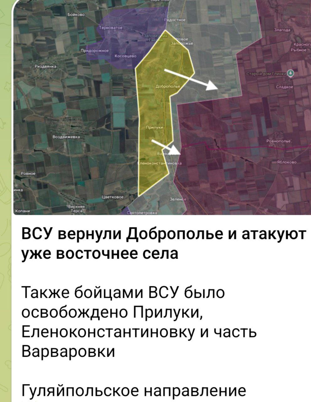 Водночас, російські воєнні оглядачі повідомляють не тільки про звільнення СОУ населених пунктів Прилуки й Оленокостянтинівки, а й про повернення Добропілля та частини Варварівки.