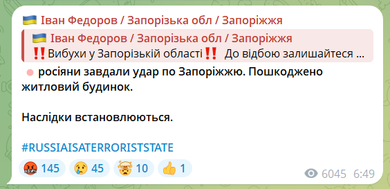 Пізніше Іван Федоров повідомив, що російські війська завдали удару по Запоріжжю. Внаслідок атаки пошкоджено житловий будинок. Наразі наслідки обстрілу уточнюються.