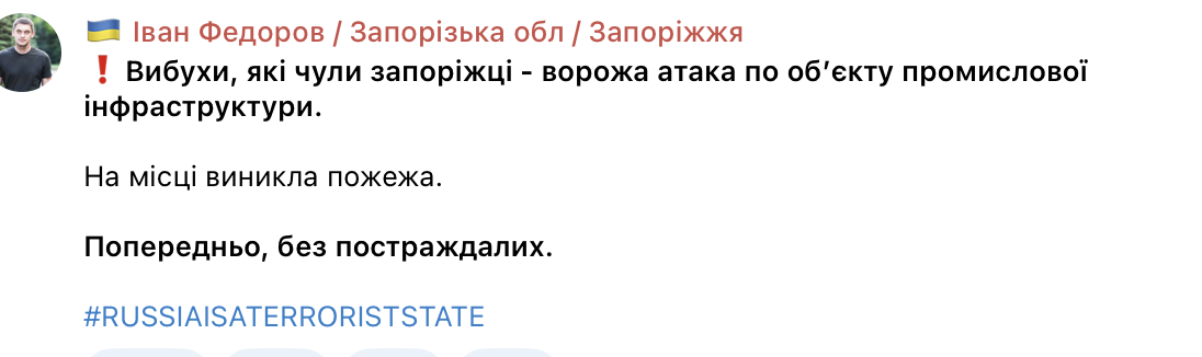Вибухи в Запоріжжі: голова ЗОВА Федоров повідомив про пожежу