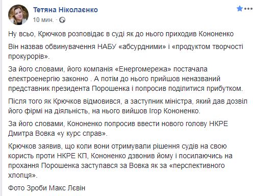 Во время заседания суда Крючков рассказал подробности участия в коррупционных схемах по вымыванию средств из “Запорожьеоблэнерго” и других эрегокомпаний. В своих показаниях Крючков прямо указывает на незаконные действия со стороны соратника и друга Петра Порошенко – народного депутата Игоря Кононенко, которые тот выполнял по указанию президента.