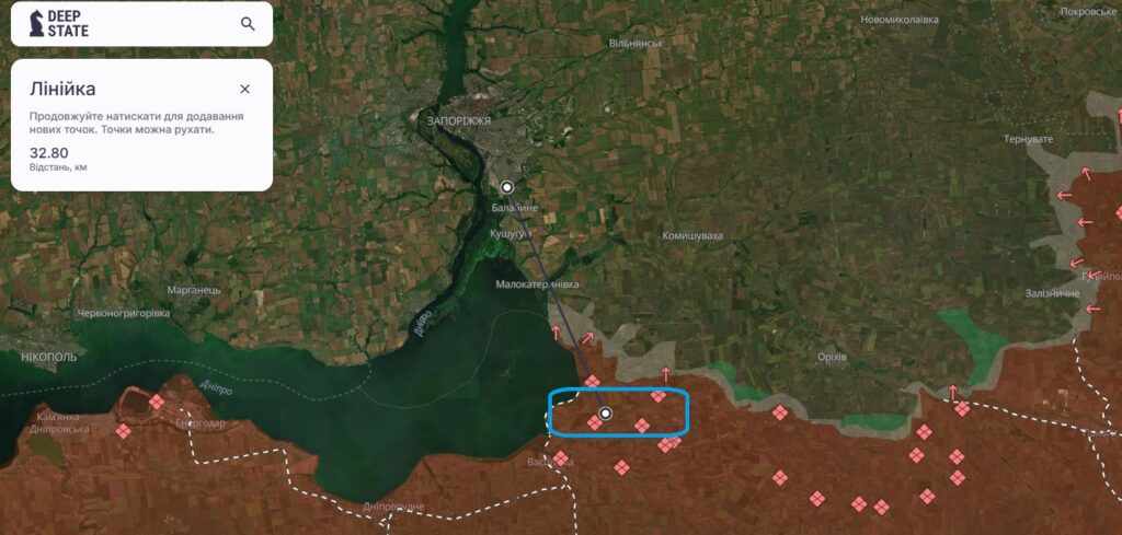 Пілоти російських FPV-дронів розташовуються ближче до Василівки. Відстань від околиць Запоріжжя до них складає більше 30 км, а в деяких випадках 40 км і більше. Дані згідно карти DeepState
