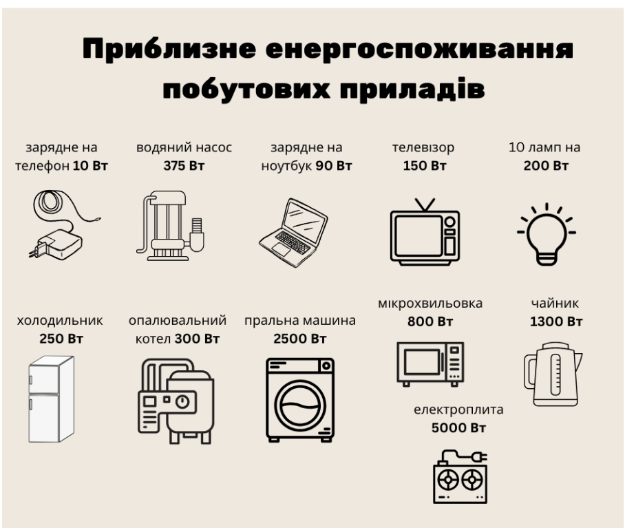 Приблизне енергоспоживання побутових приладів у будинку