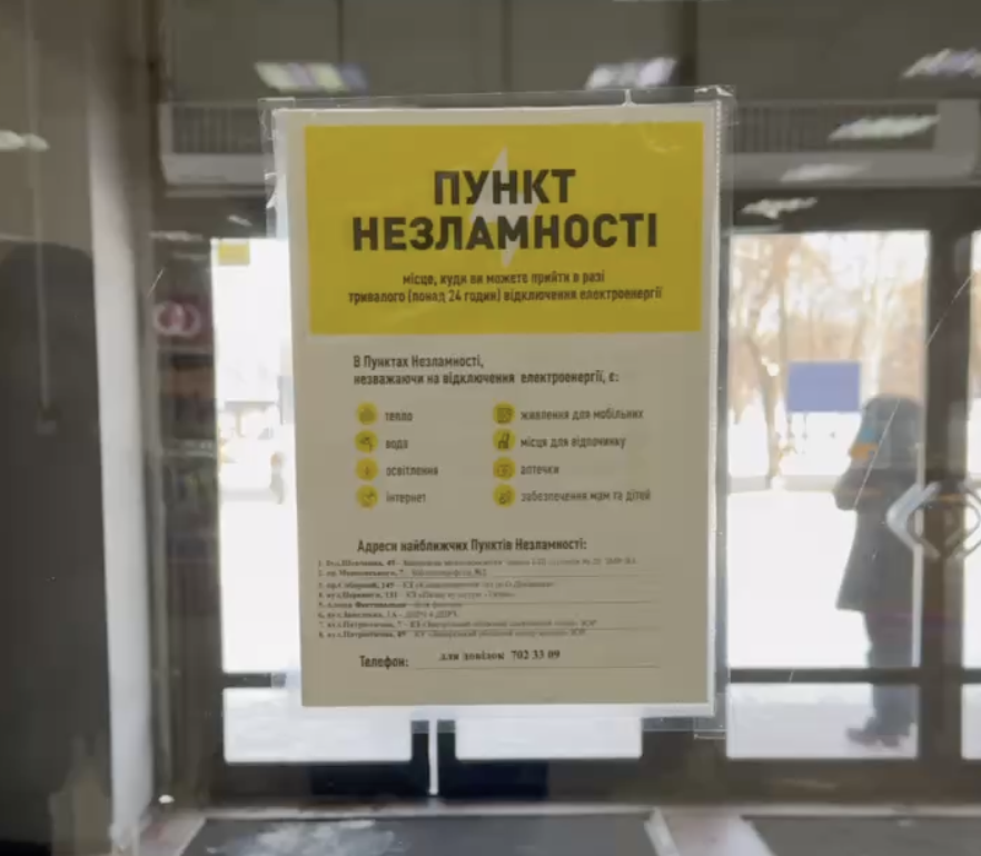 У приміщенні ТЦ «Україна» працює пункт незламності. Тут містяни можуть підзарядити мобільні телефони та інші гаджети, скористатися інтернетом, зігрітися й перебувати під час тривалих відключень електроенергії.