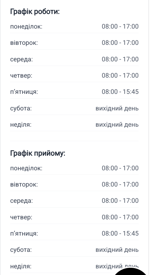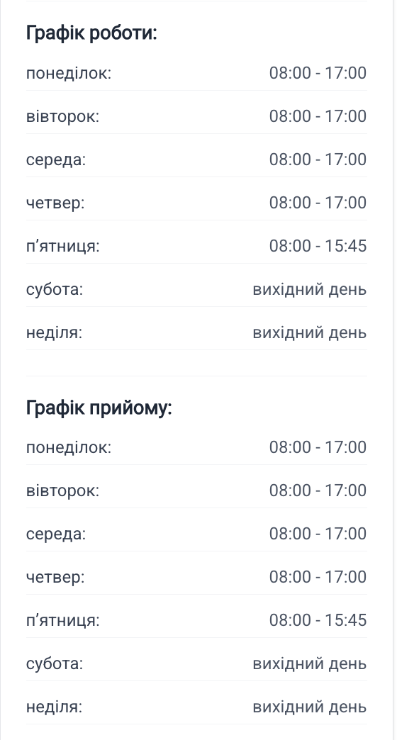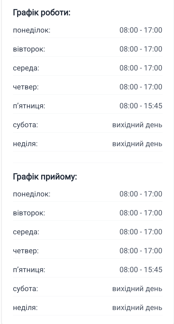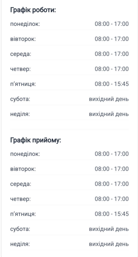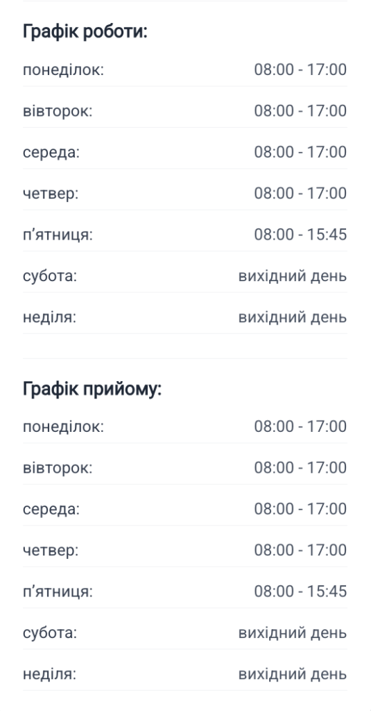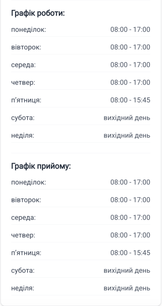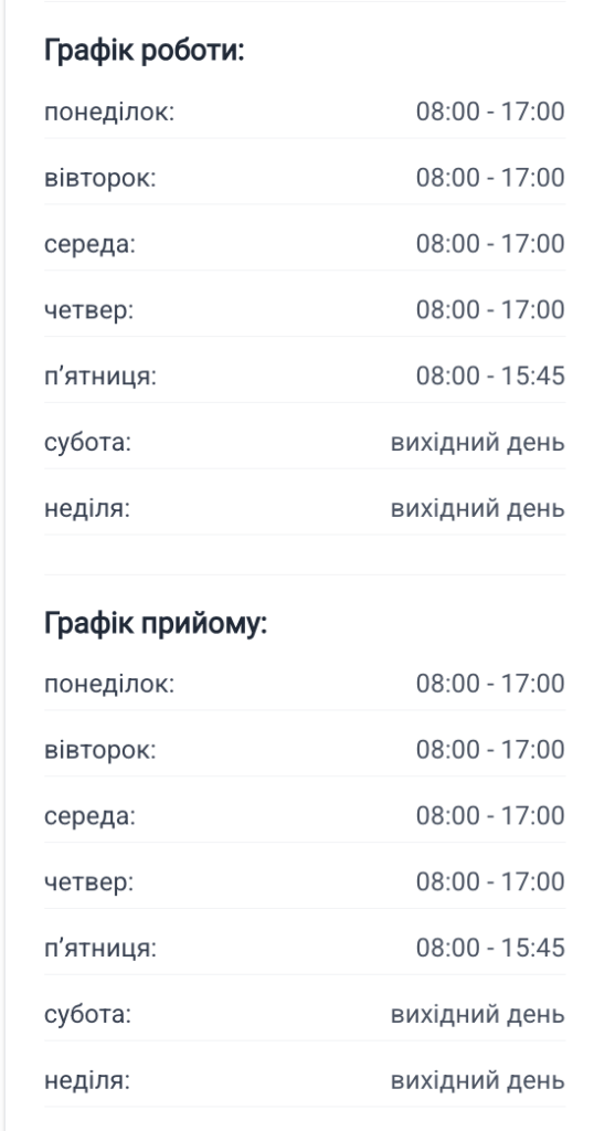 Вознесенівський ЦНАП працює за стандартним графіком без розподілу на «прийомні» та «неприйомні» години — це означає, що громадяни можуть звертатися за послугами протягом усього робочого дня.