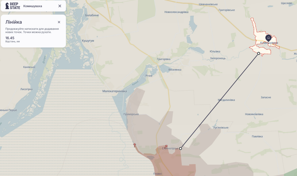 Комишуваха розташована на відстані близько 16,5 км від лінії активних бойових дій у районі Степногірськ (по прямій).