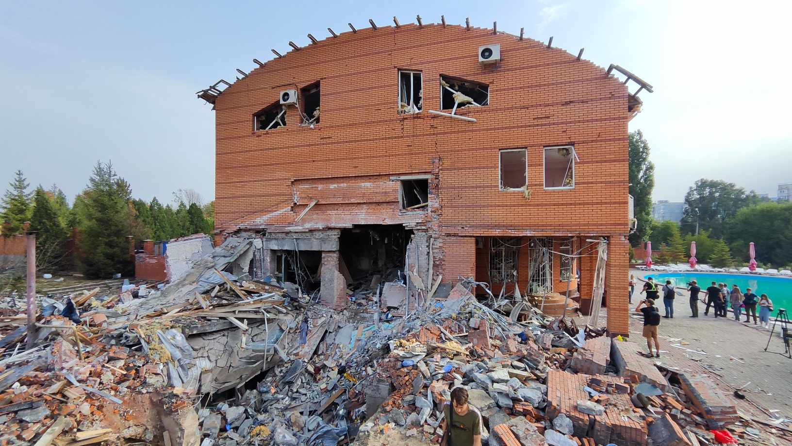 Видно, що ракета влучила у задній двір готелю, де утворилася велика воронка. Вибухова хвиля сильно пошкодила будівлю, під уламками якої опинилися постраждалі й загиблі. Завали всю ніч розбирали рятівники.