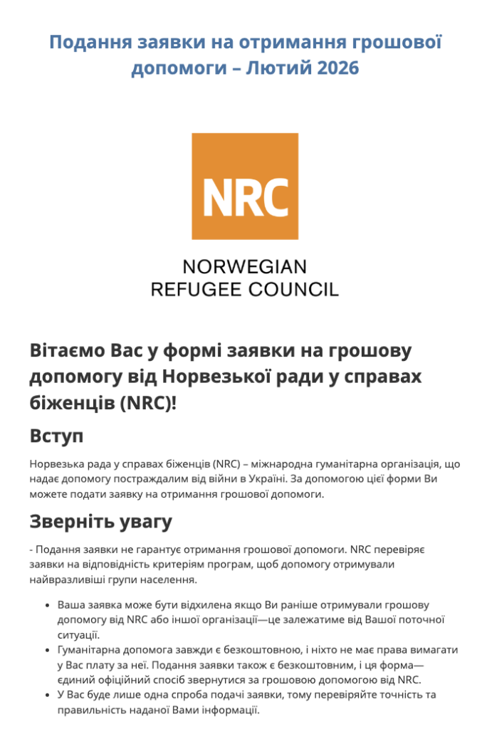 Норвезька рада у справах біженців (NRC) відкрила прийом заявок на багатоцільову грошову допомогу для мешканців Запоріжжя та області, які постраждали через війну. Подати заявку можна впродовж визначеного періоду через онлайн-форму.