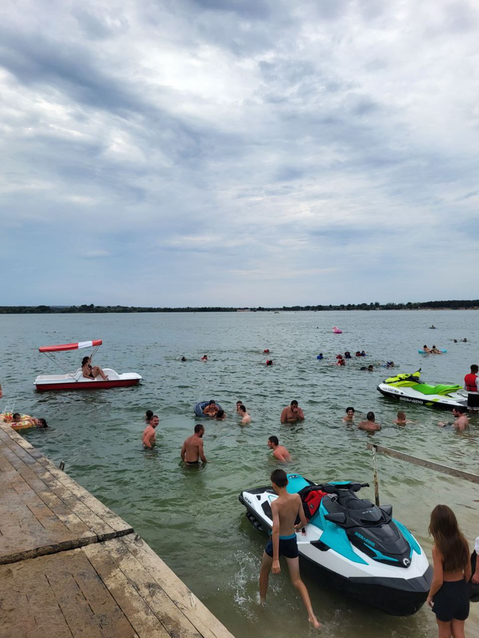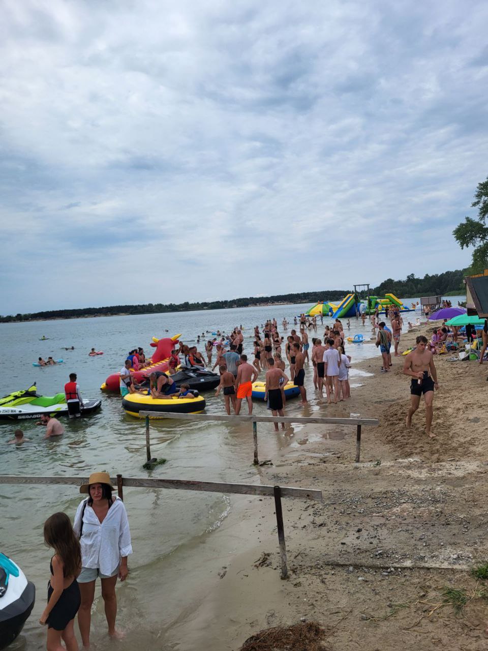 Блакитне озеро під Дніпром — популярна локація для відпочинку, куди з’їжджаються люди як з Дніпра, так і з Запоріжжя. Локація вабить багатьох, адже нагадує морські курорти — можна покататися на “банані” чи водних мотоциклах, замовити їжу чи зняти номер на “першій лінії”.