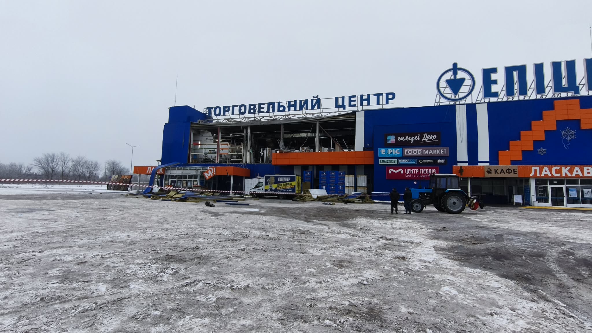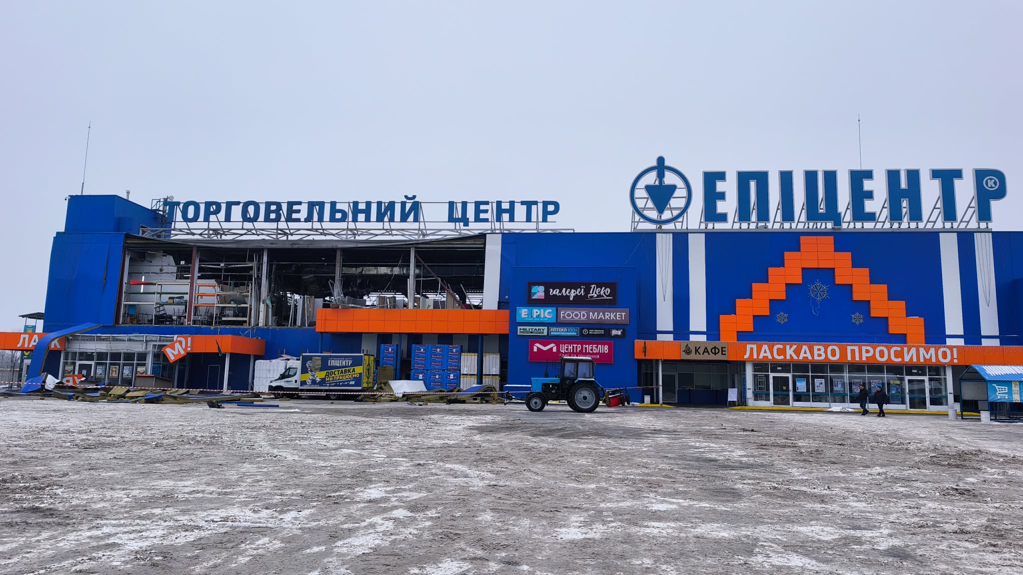 Переважних ушкоджень зазнала ліва частина гіпермаркету. Станом на зараз на цій ділянці тривають внутрішні роботи: приміщення розчищають від уламків, упорядковують простір і готують до подальших відновлювальних заходів.