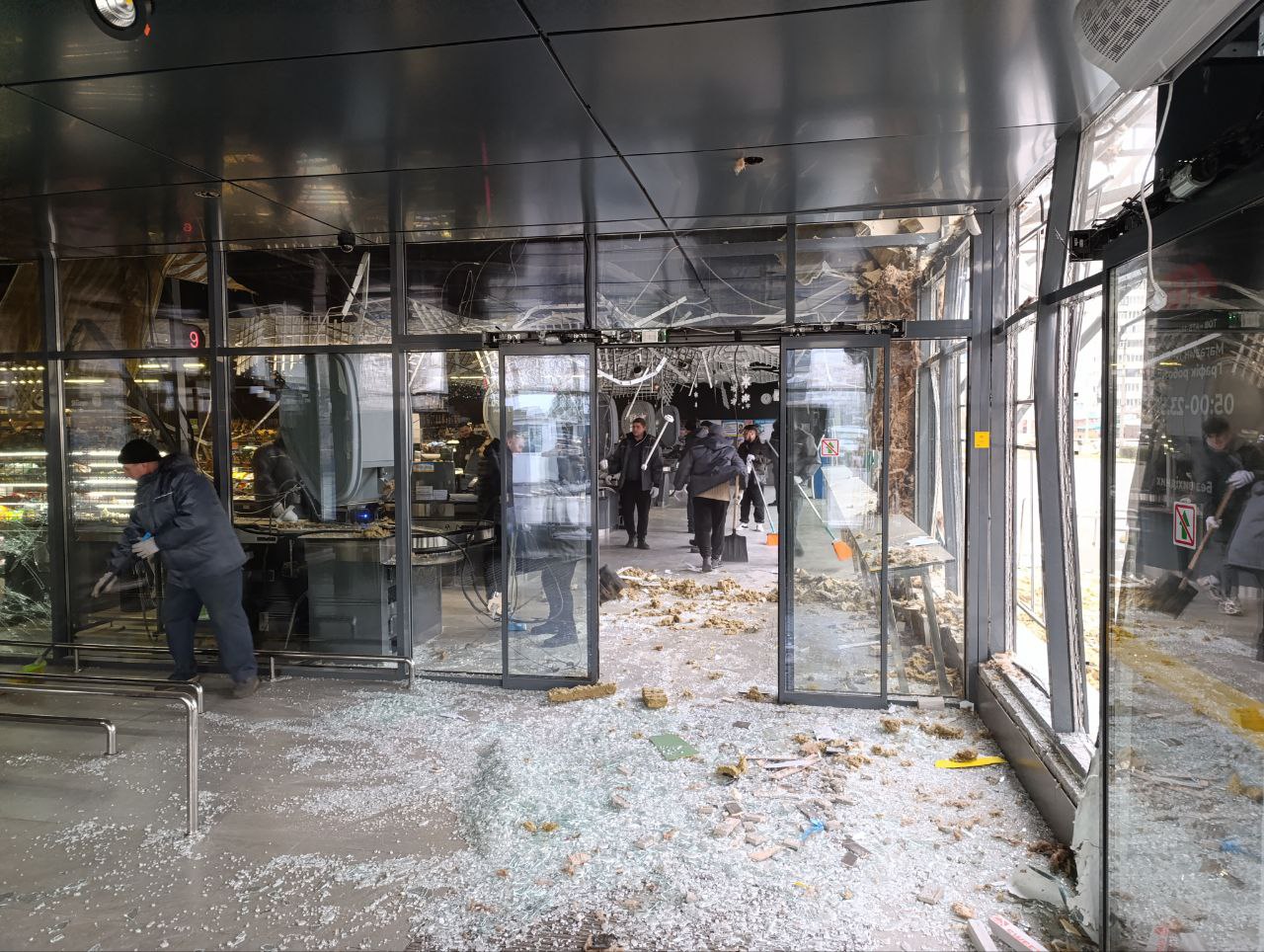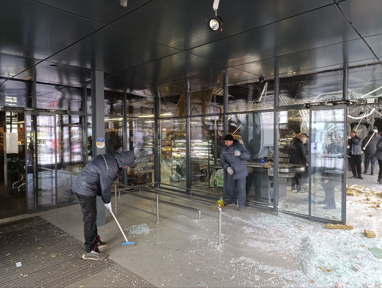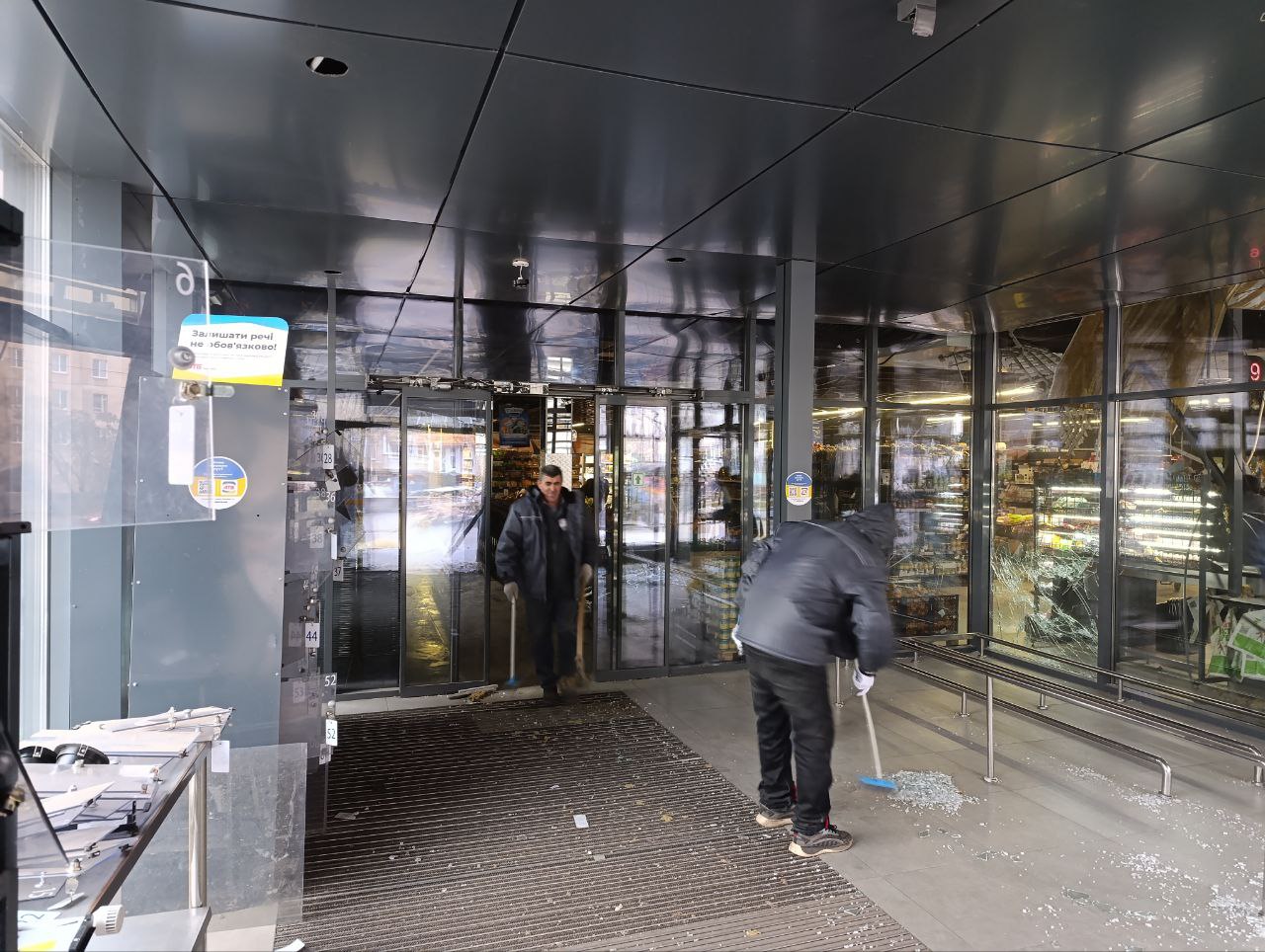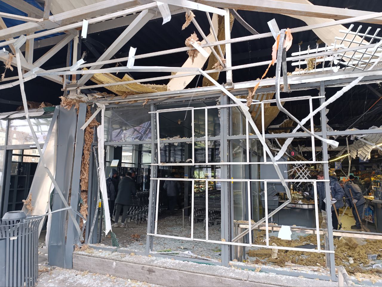 Магазин зазнав значних пошкоджень – потрощені дах, вікна, двері. Всередині триває прибирання скла й уламків. У супермаркеті досі прибирають розбите скло, понівечені вітрини, підраховують збитки.