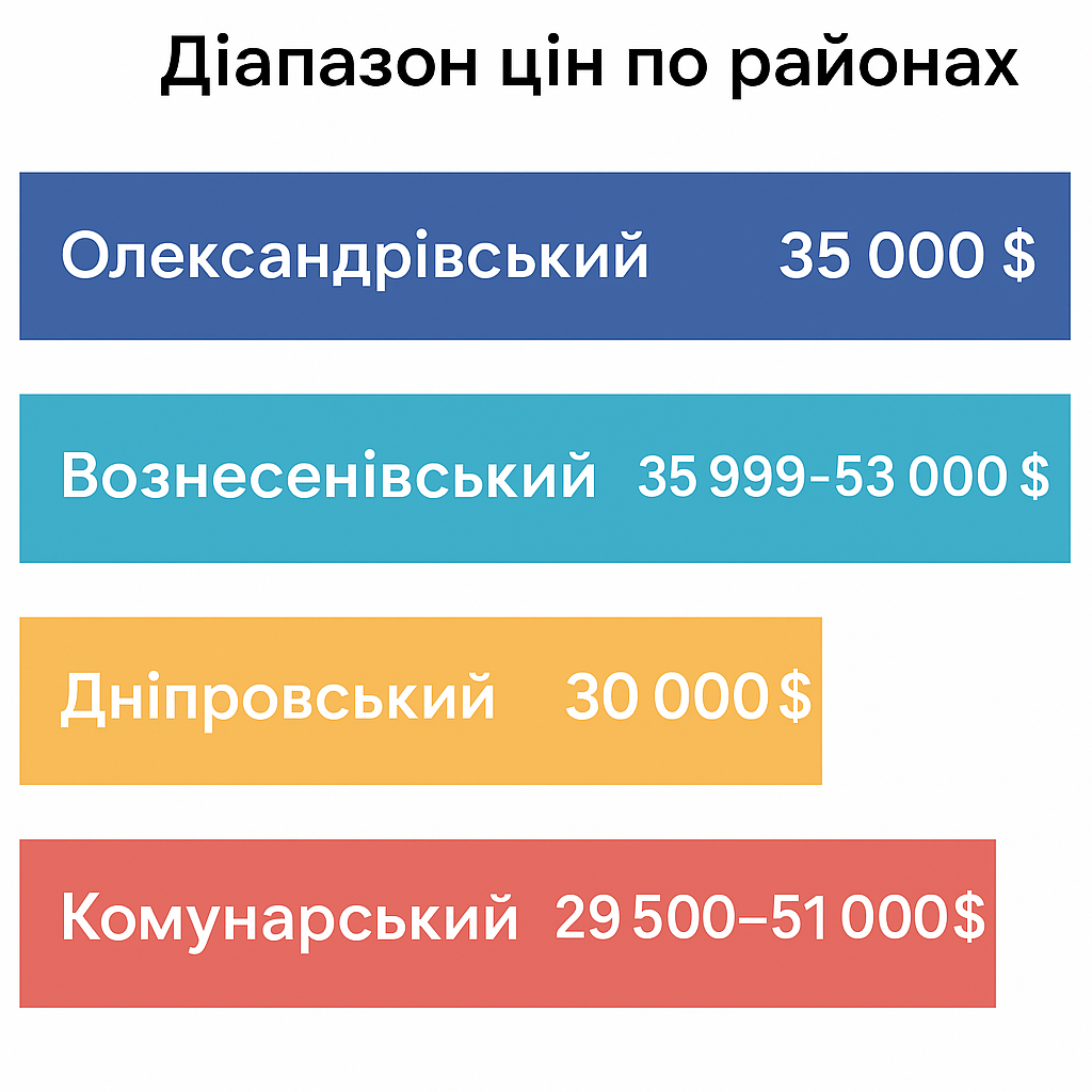 У місті одночасно виставляють на продаж як новобудови на кшталт ЖК «Основа» чи ЖК «Квартал», так і повністю готові квартири з ремонтом на бул. Шевченка, проспекті Соборному та в районах Дніпровський, Комунарський, Вознесенівський. Діапазон вартості житла, яке можна придбати за участі держпрограм, коливається приблизно від 29–30 тис. $ за двокімнатні варіанти до 50–53 тис. $ за нові великі чи відремонтовані квартири зі студійним плануванням.