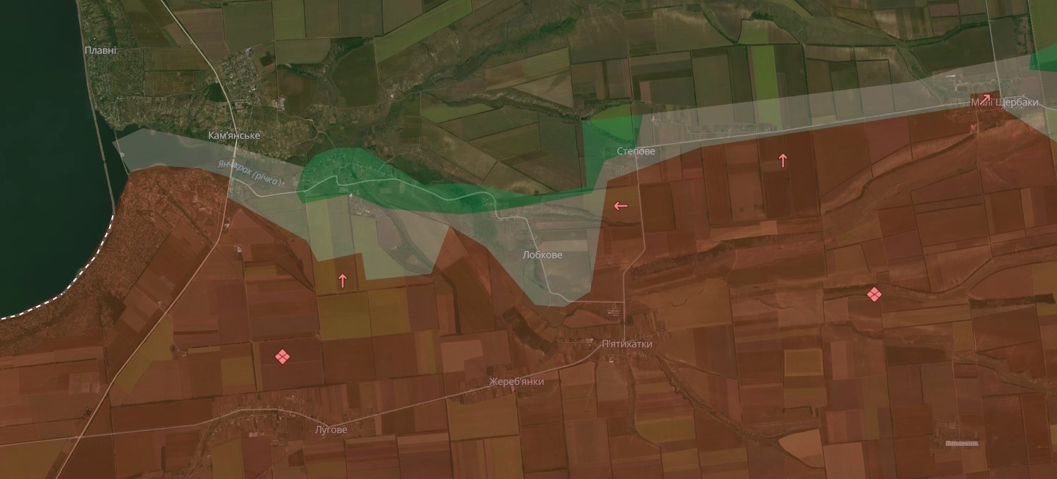 За оцінкою DeepState за останні тижні росіяни змогли дещо просунутися в районі н.п. Лобкове, Степове та Кам’янське. Фактично їм вдалося вирівняти фронт по лінії Кам’янське – Щербаки, зрізавши виступ, що був утровений під час літньої наступальної кампанії ЗСУ у 2023 році.