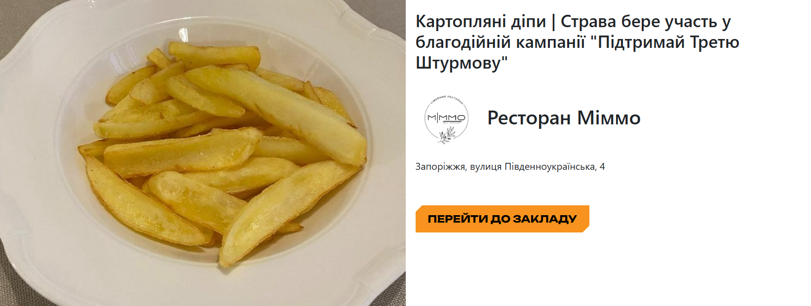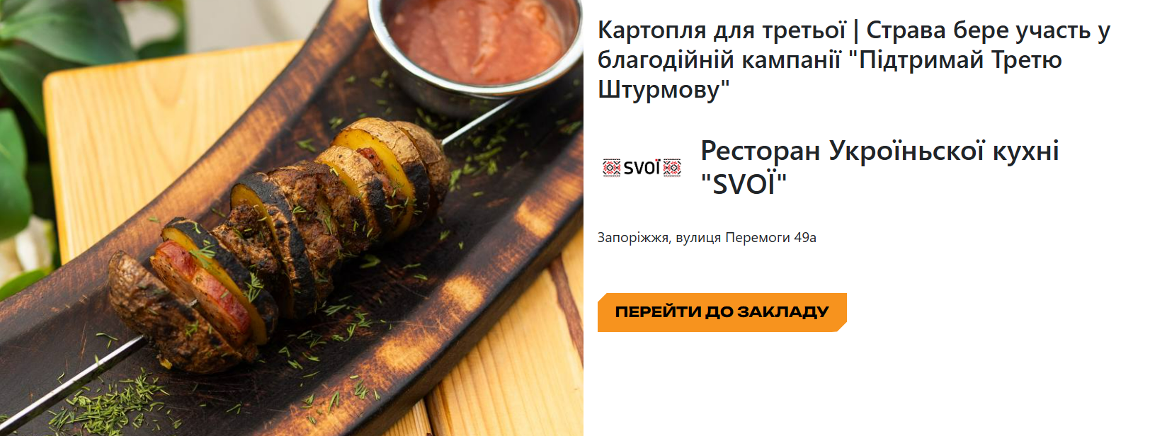 Особливістю кампанії стала проста, але символічна позиція в меню – картопля. Саме її, з позначкою «А на третє — картопля для Третьої», гості можуть замовити, знаючи, що частина коштів або повна вартість страви буде перерахована на закупівлю необхідного обладнання: дронів, РЕБів, транспорту тощо.