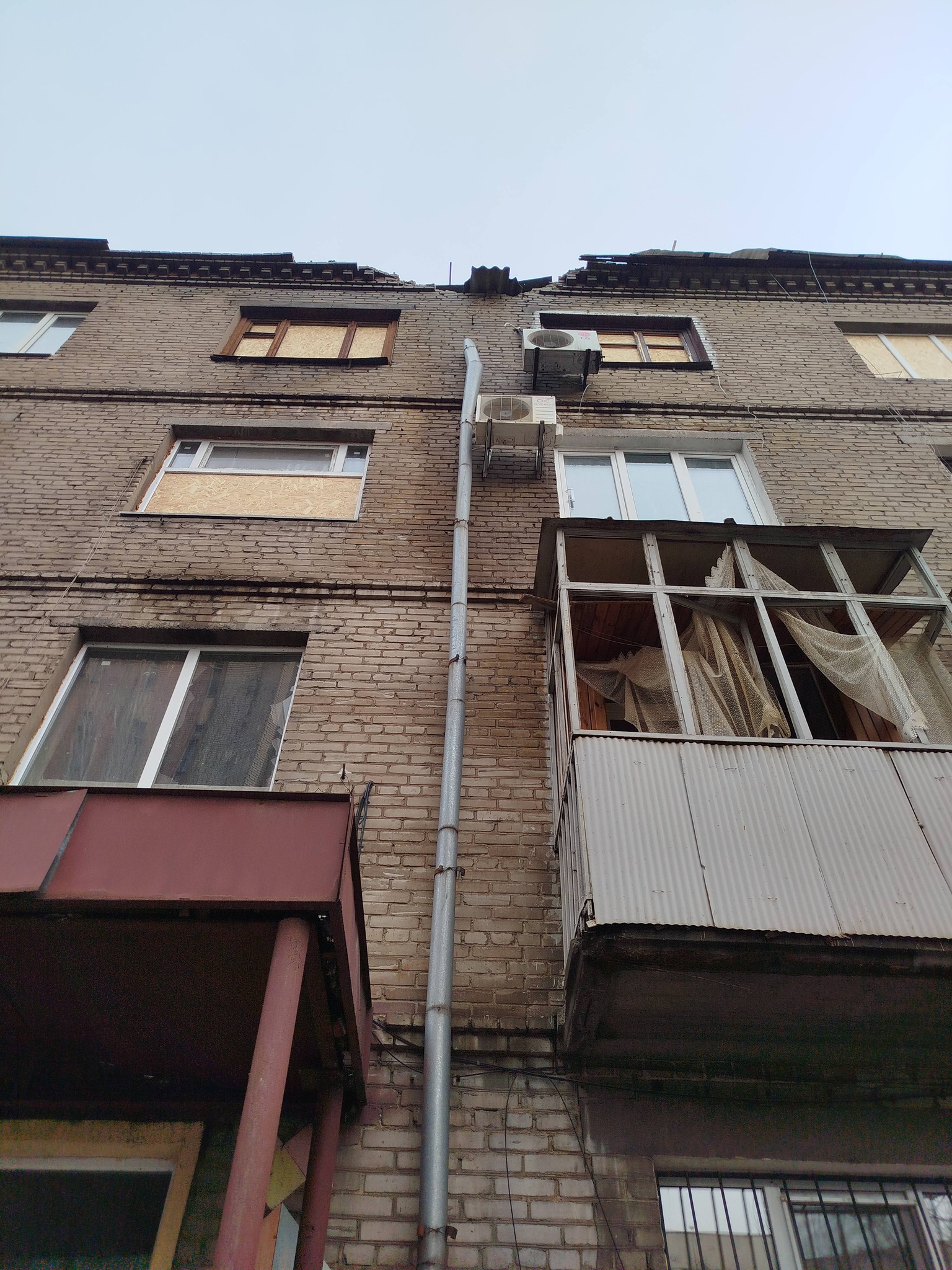Важко сказати, від чого більше постраждає наш будинок – від прильоту чи від того, що комунальники в очікуванні тендеру роблять роботу на відчепись, та будинок заливає.