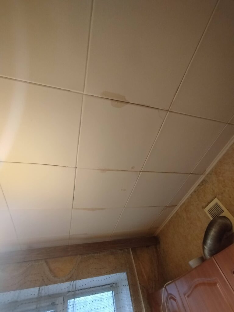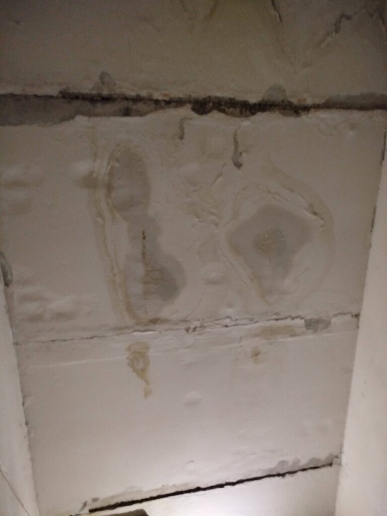 За його словами, сусіди лазять на технічний поверх міняти ведра над своєю квартирою, тим часом вода потроху йде далі стінам униз. Саме над точкою влучання вже чітко видно слід вологи до третього поверху.