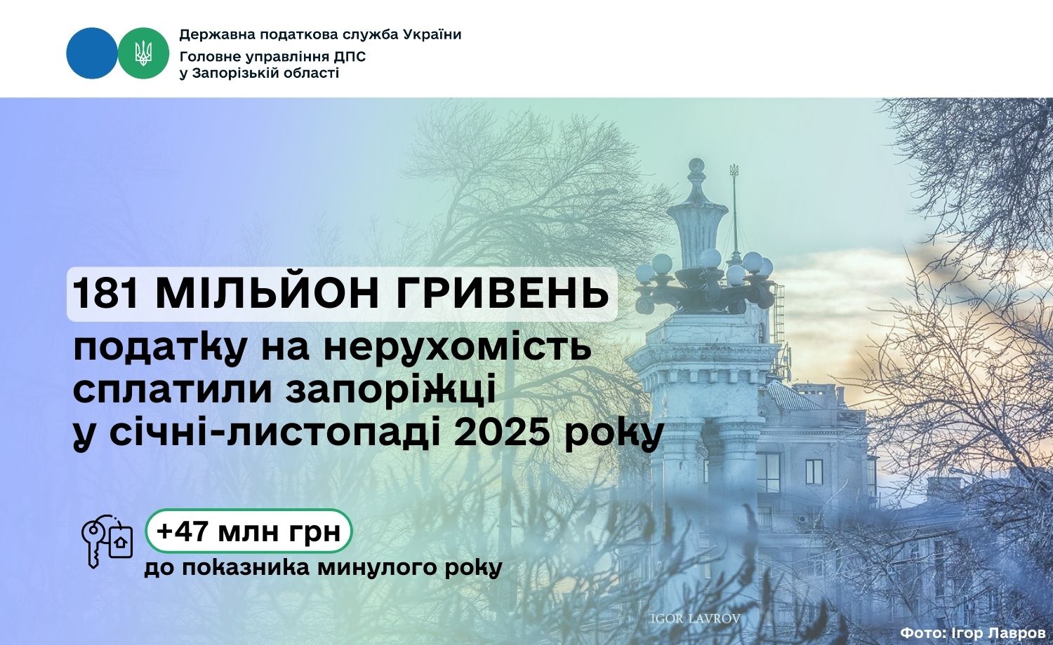 Упродовж січня–листопада до місцевих бюджетів Запорізької області надійшло 181,5 мільйона гривень податку на нерухоме майно. Про це повідомила начальниця Головне управління ДПС у Запорізькій області Оксана Федорова.