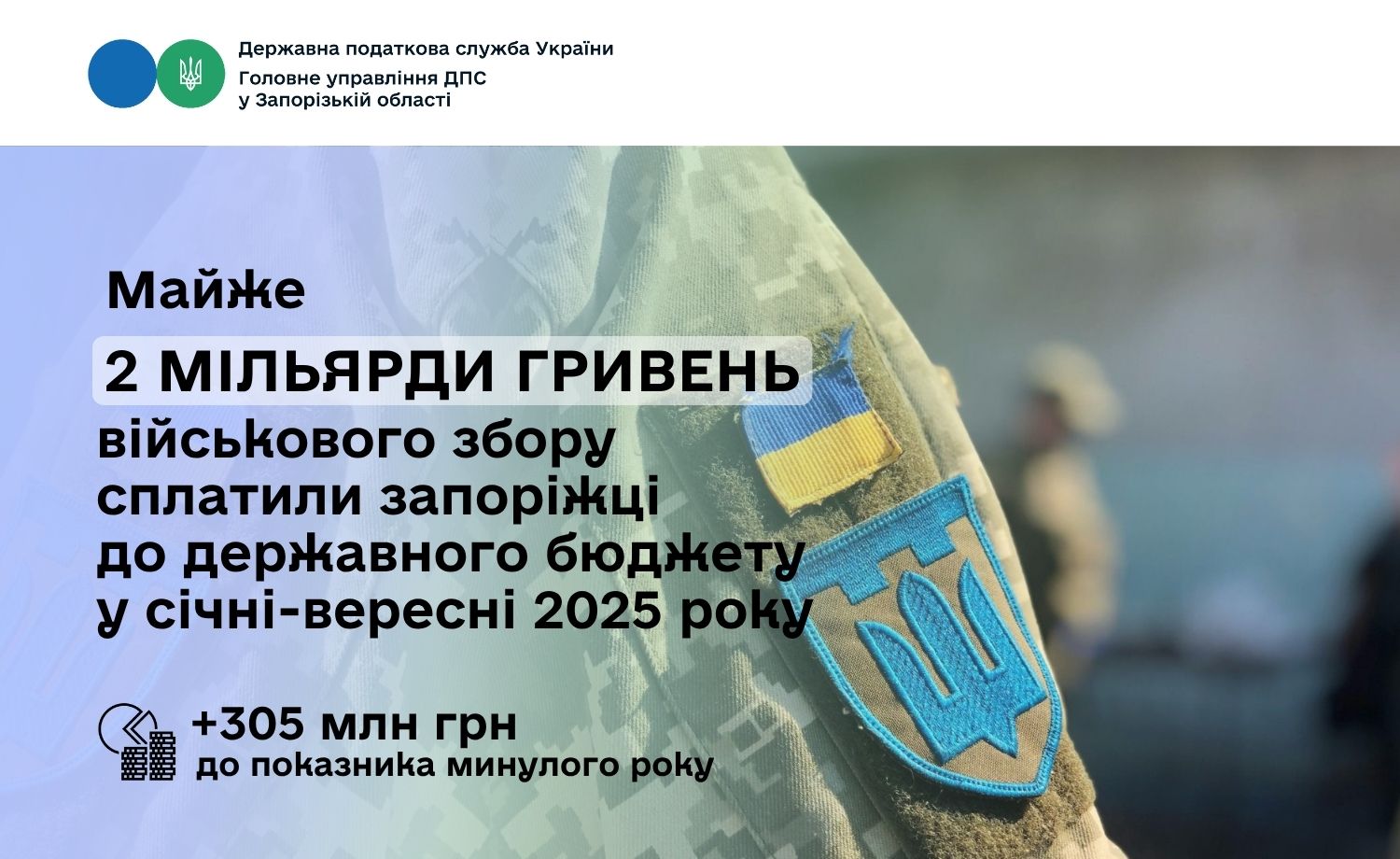 У січні–вересні платники податків Запорізької області перерахували до державного бюджету 1 мільярд 903 мільйони гривень військового збору. Як повідомила начальниця Головного управління ДПС у Запорізькій області Оксана Федорова, це на 305 мільйонів гривень (19%) більше, ніж за аналогічний період торік.