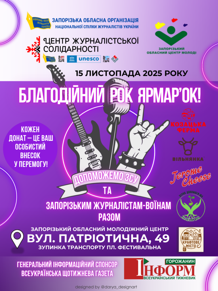 Вже цієї суботи в Запорізькому обласному центрі молоді відбудеться благодійний ярмарок «РОК ЯРМАР’ОК». Крафтові виробники та концерт від запорізьких виконавців запалять цю осінь. Всі зібрані кошти підуть на ЗСУ та запорізьким журналістам-воїнам