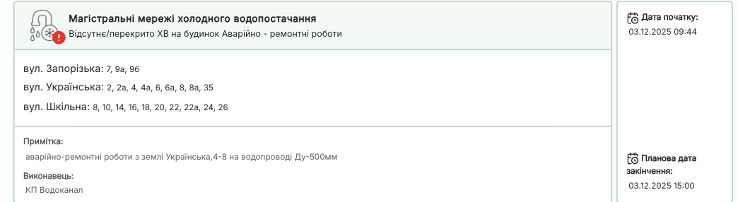 Аварія сталася на ділянці водогону на вул. Українській, 4–8 (Ду-500 мм). Подачу холодної води тимчасово припинено за такими адресами: