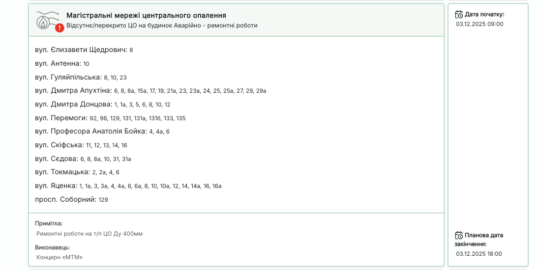 Запоріжжя без води й тепла: оприлюднено повний список адрес, де сьогодні аварії