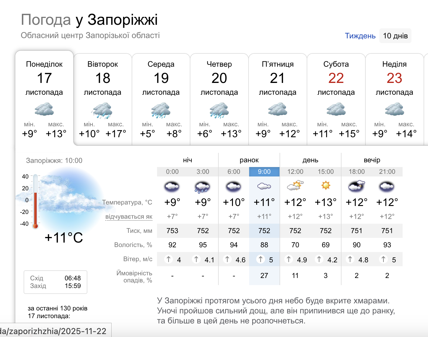 У Запоріжжі починається справжній осінній сезон дощів. Згідно з прогнозом синоптиків, опади накриють область уже з 17 листопада і триватимуть майже весь тиждень. Найінтенсивніші зливи очікуються 18 та 20 листопада, коли температура вдень підніматиметься до +13…+17°C, але атмосферний фронт принесе рясні дощі та підвищену вологість.