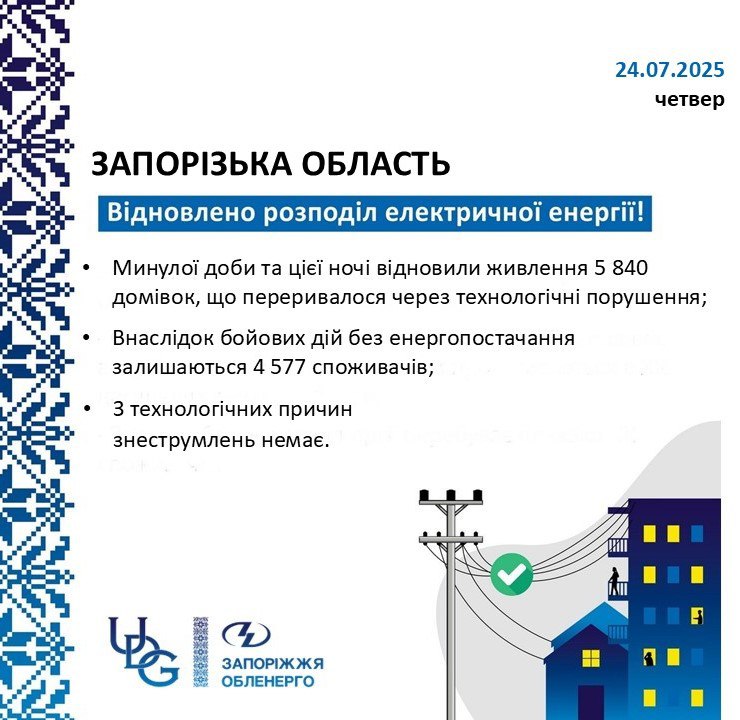 Станом на 08:00 24 липня, через бойові дії без енергопостачання на підконтрольній території Запорізької області залишаються 4 577 споживачів.