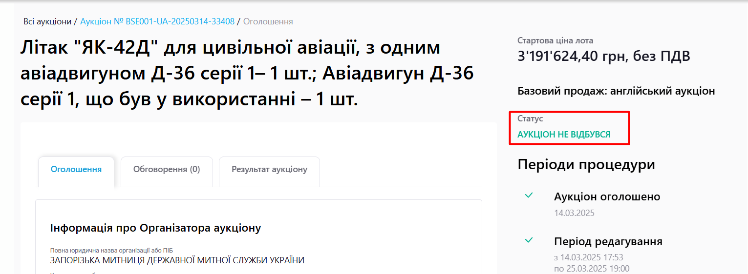 Проведення наступного аукціону зі вже зниженою вартістю літака до 2 393 718.30 грн (без ПДВ) призначено на 8 квітня 2025 року.