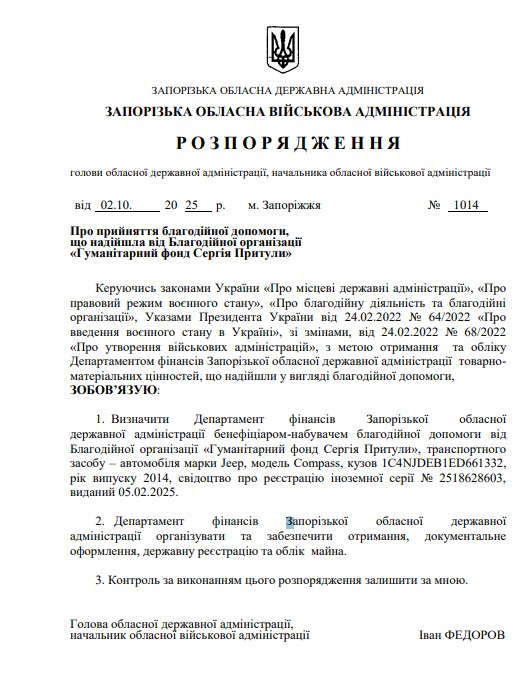 Згідно з документом, Департамент фінансів Запорізької ОДА визначено бенефіціаром-набувачем благодійної допомоги. Йдеться про транспортний засіб — автомобіль марки Jeep Compass, кузов 1C4NJDEB1ED661332, 2014 року випуску, свідоцтво про реєстрацію іноземної серії № 2518628603, видане 5 лютого 2025 року.