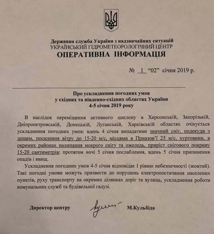 Прогнозируется образование покрова снега на уровне 15-20 см. Сопровождаться метели будут сильными порывами ветра до 15-20 м/с, а в Приазовье местами до 25 м/с. Ухудшение погодных условий 4-5 января оценивается как желтый уровень опасности.