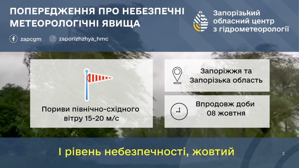 Так, впродовж доби 08 жовтня очікуються пориви північно-східного вітру 15-20 м/с (І рівень небезпечності, жовтий). Погодні умови можуть призвести до пошкодження ліній електропередач, падіння дерев, систем освітлення, заносу та перевертання автомобілів, збільшення ДТП.
