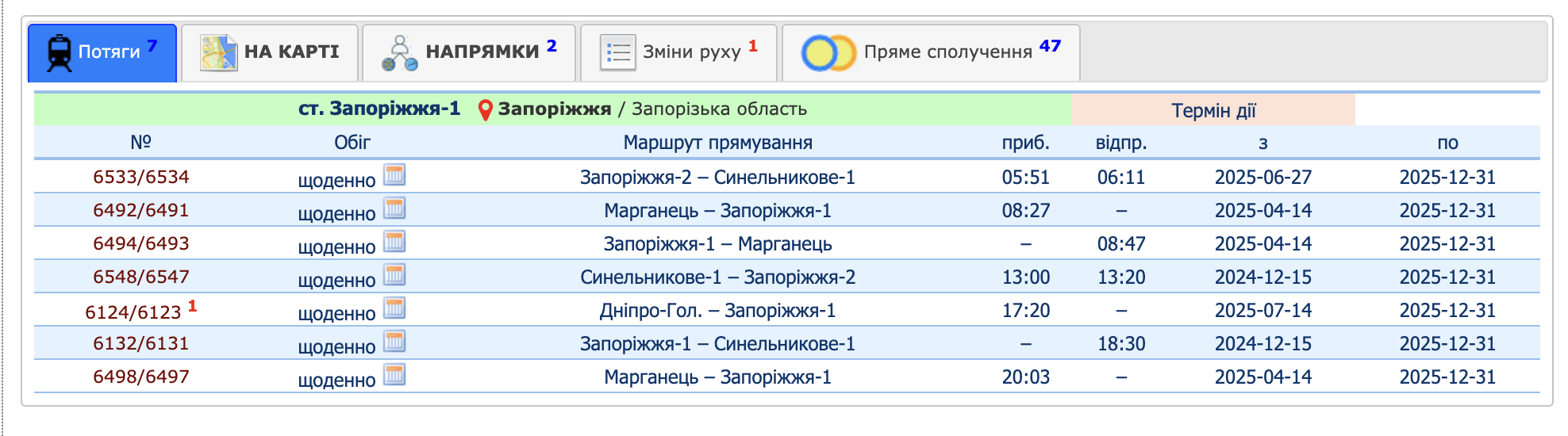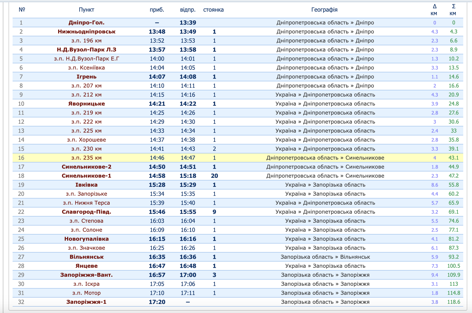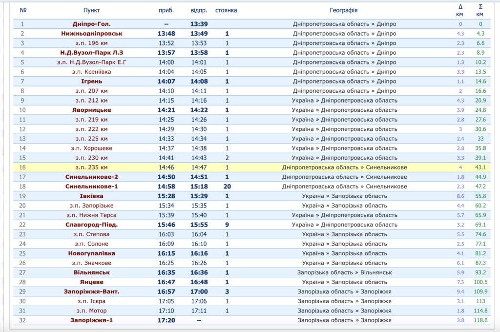 - Запоріжжя-1 — прибуття о 17:50