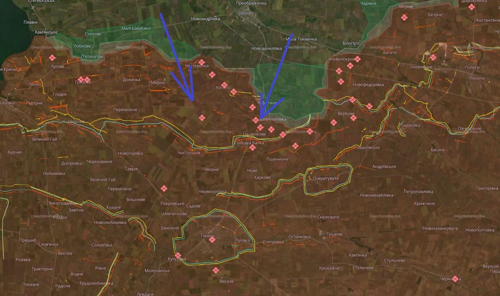 Розширення флангу на захід від Роботиного дуже важливе для подальшого просування та звільнення н.п. Копані. Крім того – там знаходяться панівні висоти. Геолоковані позиції ЗСУ на захід від Роботиного були за опублікованими відео російських джерел, на яких ті здійснюють обстріли по українцях.