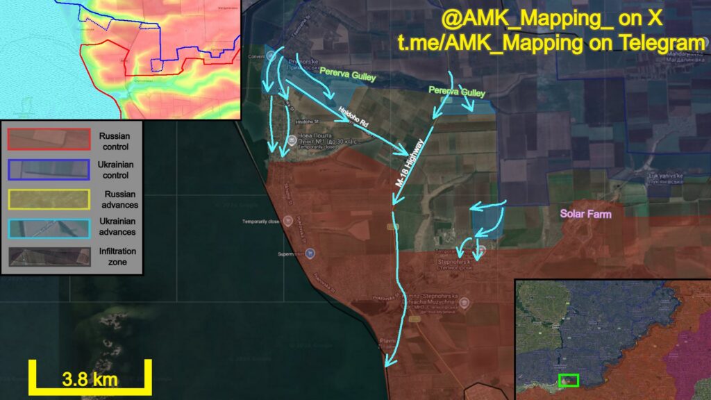 Сили оборони встановили контроль над центром села та почали проникнення на південні вулиці. Наразі там сформувалася так званий “пиріг”, де позиції українських і російських військ частково накладаються одна на одну. Також українці повністю зачистили останні ділянки місцевої балки та просунулися на південний схід у напрямку перехрестя з трасою М-18.