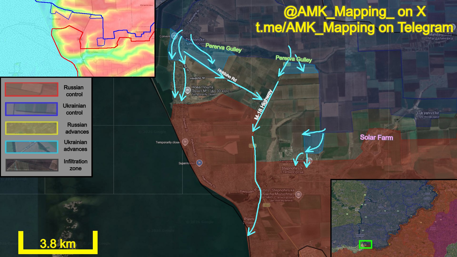 Просування українських підрозділів уздовж М-18 у районі Плавні та Приморське створює загрозу для російських шляхів постачання в напрямку Степногірськ і далі — до тимчасово окупованих територій півдня області.