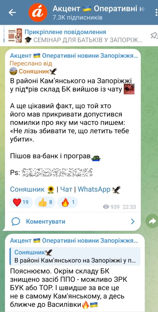 Штурмову операцію Сил оборону у Степногірську також підтримує авіація. Близький до пілотів Повітряних сил телеграм-канал Соняшник вчора повідомив про успішне знищення складу БК та російського ЗРК неподалік Кам’янського.