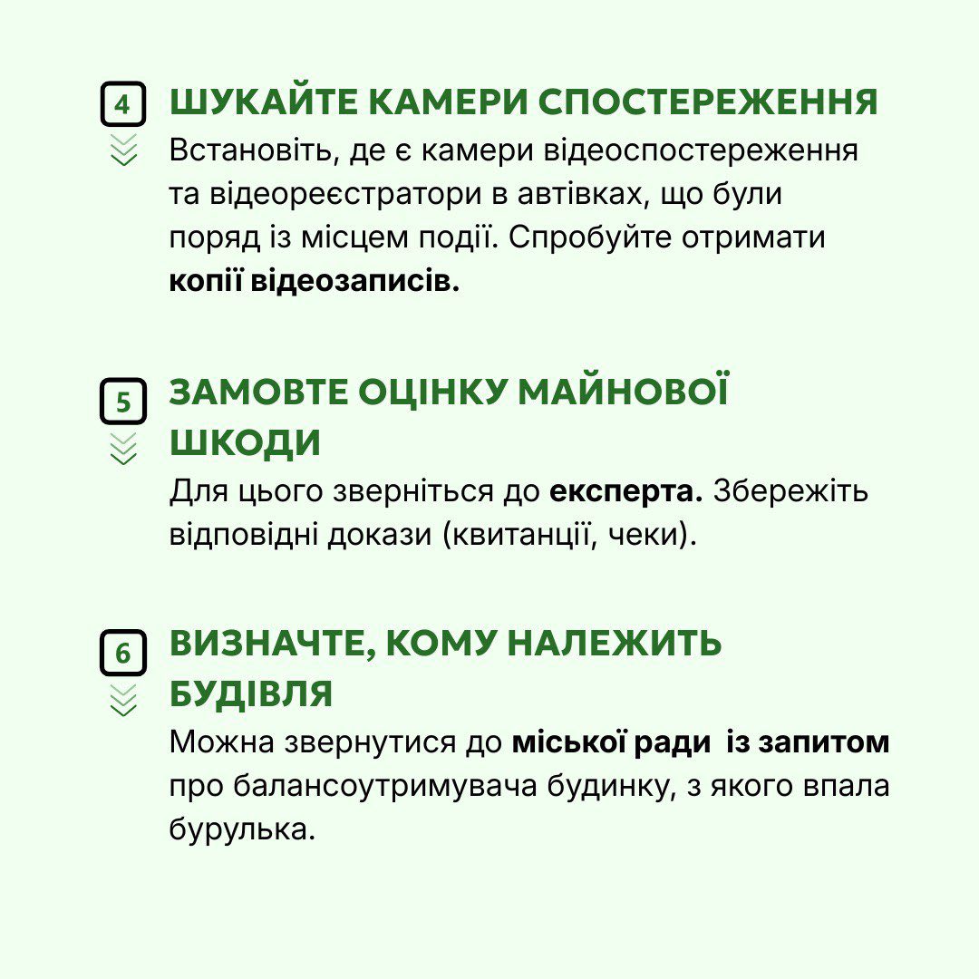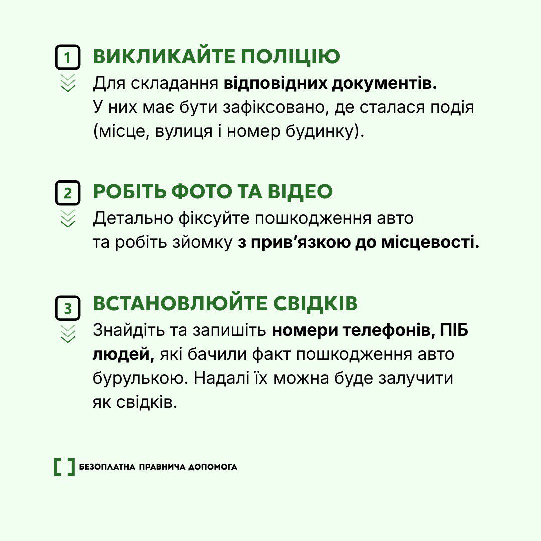 У Бюро безоплатної правничої допомоги нагадують: якщо на припарковане під будівлею авто впала бурулька, насамперед необхідно зафіксувати факт пошкодження. Для цього варто викликати поліцію, зробити фото- та відеофіксацію наслідків, а також зібрати контактні дані можливих свідків.